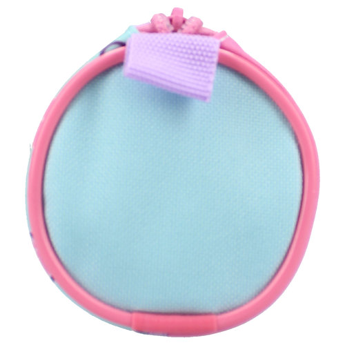 Estuche rosa rematado con detalles en azul y morado, como la cremallera.
