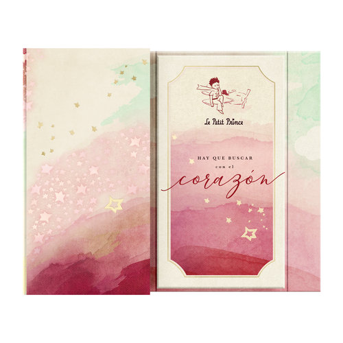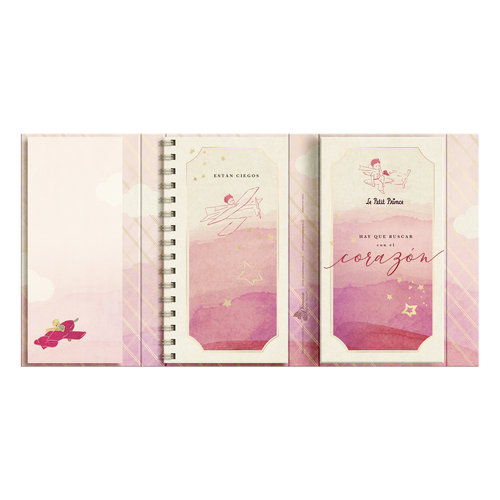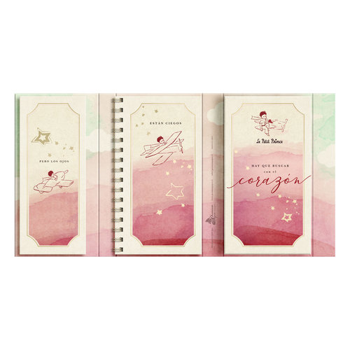 Triptico Principito, contiene 1 block, 1 libreta y 1 bolsillo. Su portada tiene folia y barniz UV sectorizado. Las hojas interiores son color crema de suave papel de bambu, por lo tanto es un producto ecologico. Cierre magnético.