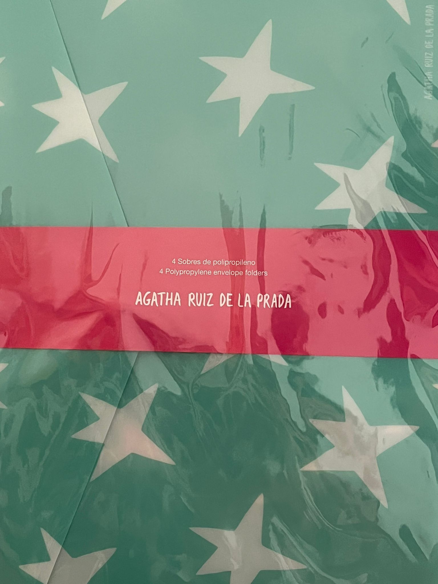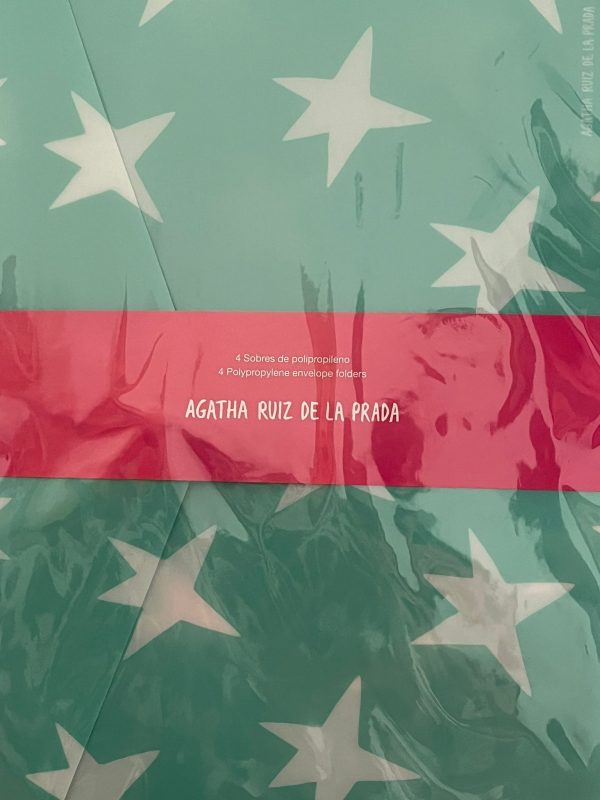 Sobres de polipropileno con cierre clic, modelo Estrellas, diseñados en exclusiva por Agatha Ruiz de la Prada. Tamaño: 335 x 240 x 2 mm. Aptos para hojas de tamaño A4 (210 x 297 mm). Los sobres de polipropileno te permitirán archivar, ordenar y transportar todos tipo de documentos, imágenes, trabajos, libros, etc. Fabricados en polipropileno opaco de 0,2 mm, lo que les aporta flexibilidad y resistencia al mismo tiempo