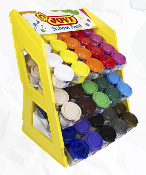 La témpera JOVI esta disponible en una extensa gama de divertidos colores que se pueden mezclar y que convertirán en una obra de arte cualquier superficie de papel, cartulina, madera, tela, pasta de modelar o fango.
